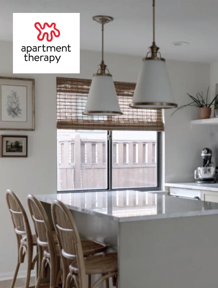 Apartment Therapy transformed a small 140-square-foot kitchen with our custom bamboo shades' Twirl collection